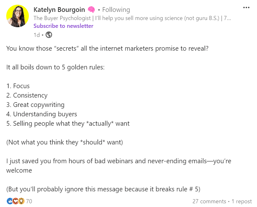 Katelyn Bourgoin ( a buyer psychologist ) once stated this in one of her post on LinkedIn: